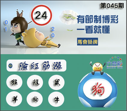 045期正版彩图挂:24 爆:狗 挂牌成语:脸红筋涨 挂牌出肖:猴龙鼠羊狗牛